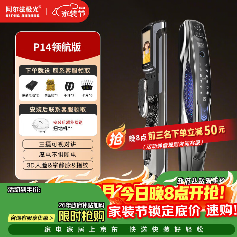 阿尔法极光(ALPHA AURORA)智能门锁P14领航版 三摄掌静脉人脸指纹识别密码锁入户门上门安装