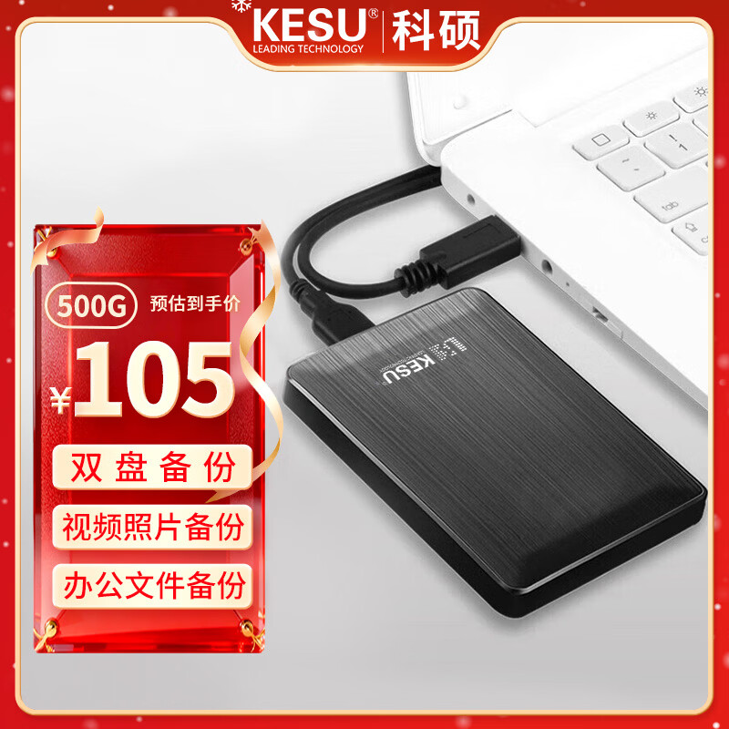科硕(KESU)500GB 移动硬盘大容量 双盘备份USB3.0 外接机械硬盘250+250G 照片视频存储备份 K1 2.5英寸大U盘