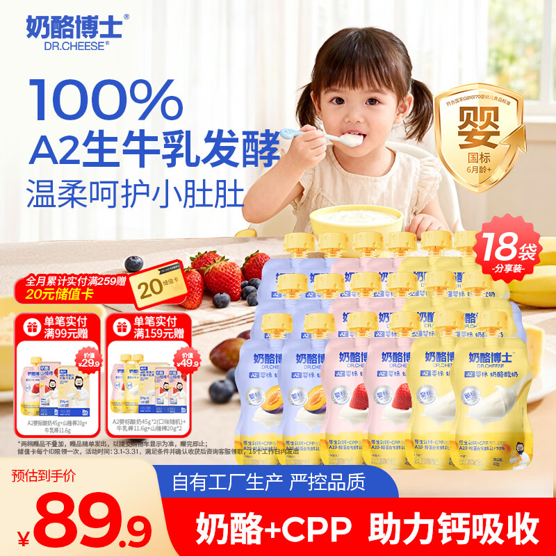 奶酪博士A2婴标奶酪酸奶45g*18 宝宝酸奶0蔗糖真果泥原生营养常温