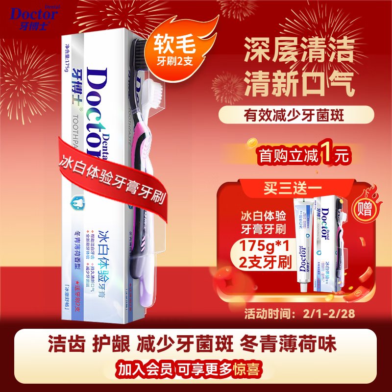 牙博士冰白体验牙膏牙刷洁齿减少牙菌斑清新口气175g*1支+牙刷2支薄荷味