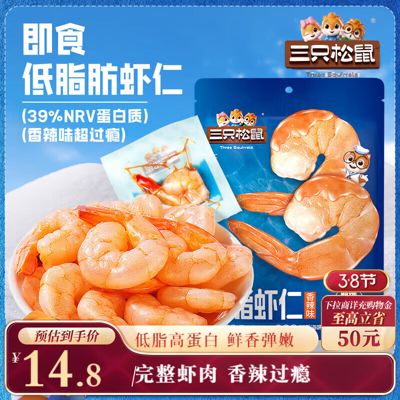 三只松鼠即食低脂虾仁50g 香辣味独立小袋减脂健身高蛋白海鲜零食