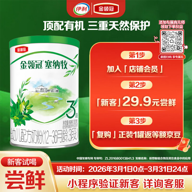 伊利金领冠塞纳牧【首款HMO】有机A2β-酪蛋白奶粉3段130g(12-36个月)