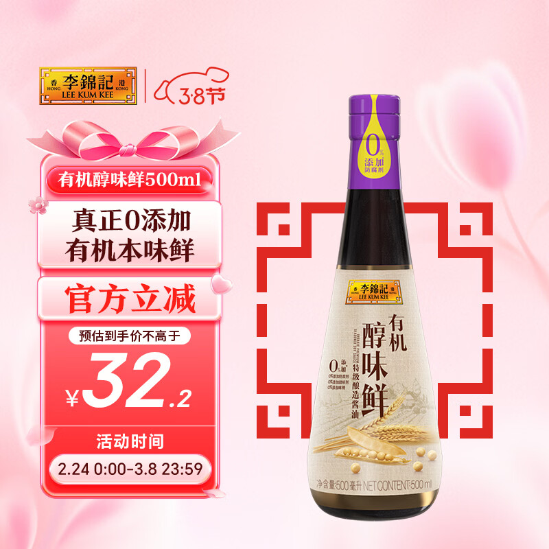 李锦记 有机醇味鲜500ml【特级 0添加】有机认证健康安心 头道 酱油生抽