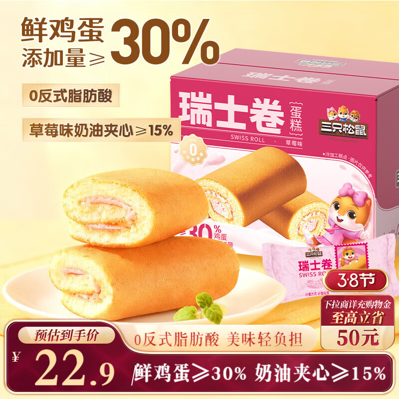 三只松鼠瑞士卷700g 草莓味营养早餐夹心面包办公室饱腹代餐下午茶点心