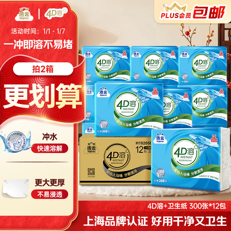 洁云卫生纸 4D溶+300张(3层)*12包 速溶压花平板纸 抽纸厕纸纸巾整箱
