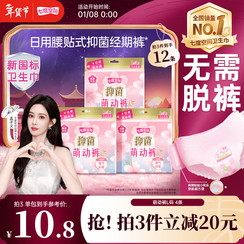 七度空间萌动裤透气清新抑菌安心裤日用裤型卫生巾4片【新国标认证】