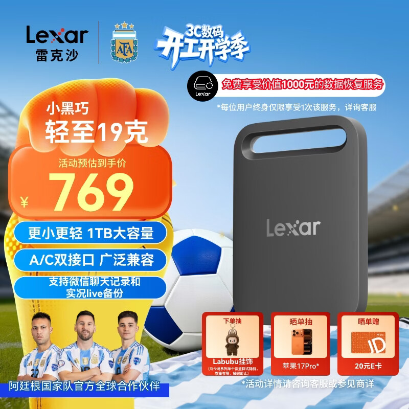 雷克沙(Lexar)Air小轻块1TB Type-c USB3.2移动固态硬盘(PSSD)SL260传输速度400MB/s手机直连 轻松扩容 小黑巧