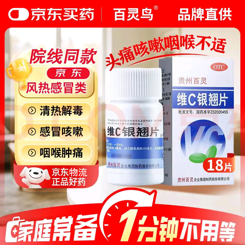 百灵鸟 贵州百灵 维C银翘片18片 感冒咳嗽 清热解毒 外感风热 流行性感冒 发热头痛 咳嗽口干 咽喉疼痛