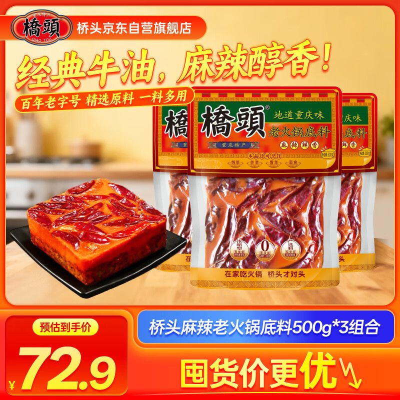 桥头麻辣牛油火锅底料500g*3重庆火锅调料小块底料