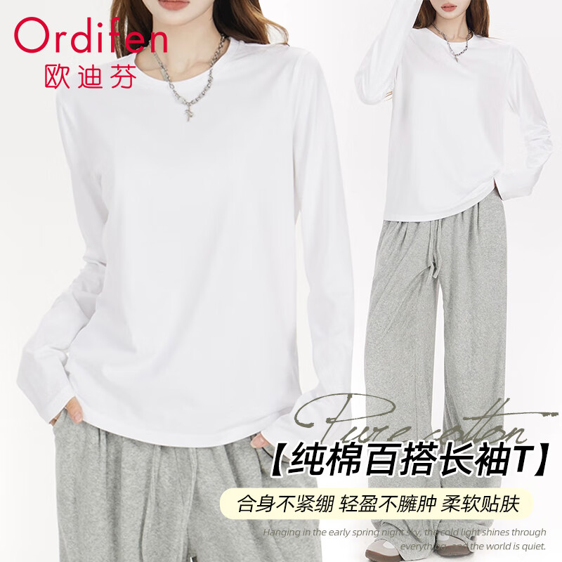 欧迪芬打底衫女100%纯棉秋冬舒适亲肤纯色圆领长袖t恤女秋衣简约t恤白S