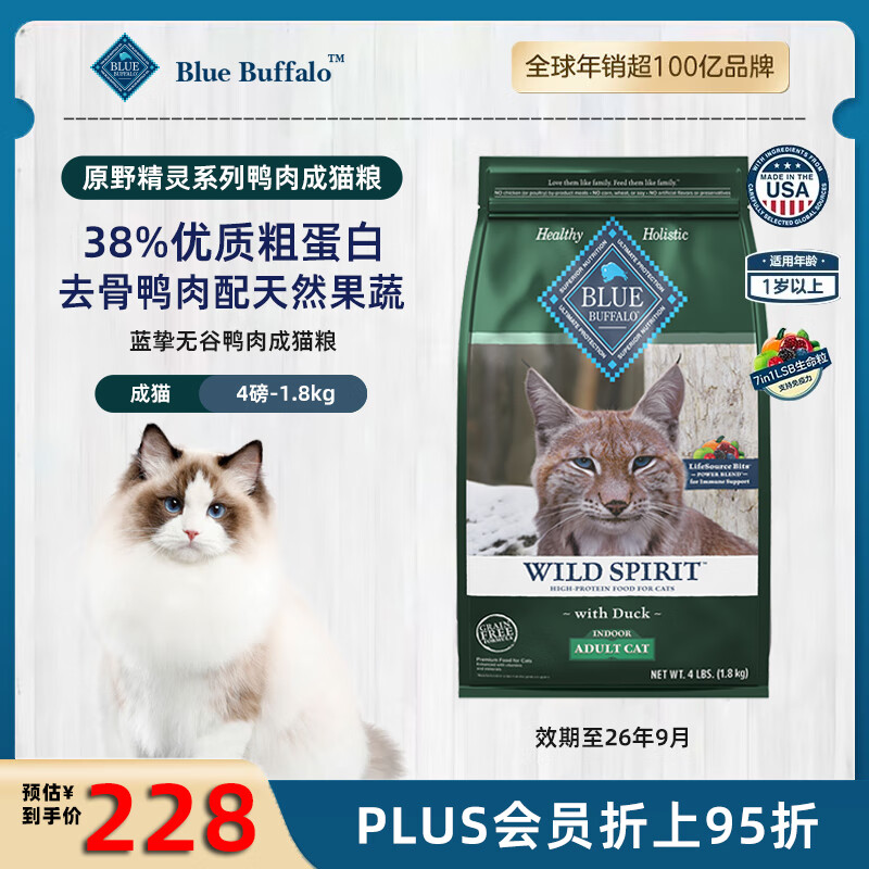Blue Buffalo蓝馔美国进口原野精灵无谷全价成猫猫粮鸭肉口味1.8kg/4磅