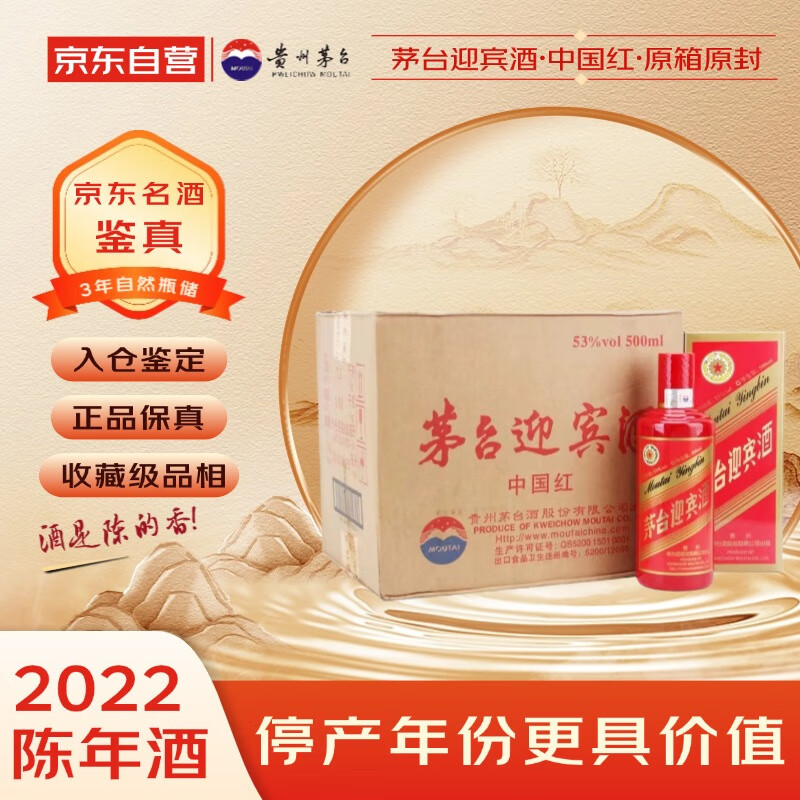 茅台 迎宾酒(中国红)2022年 酱香型白酒 53度 500ml*6 原箱原封 陈年老酒 收藏礼赠宴请【名酒鉴真】