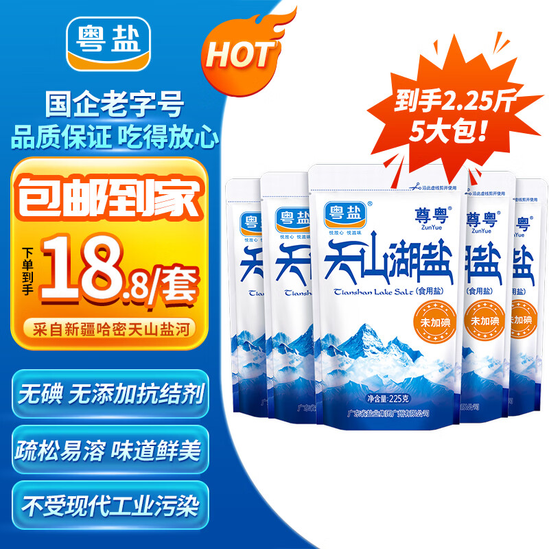 粤盐天山湖盐225g*5包 【未加碘】无碘盐 0添加 无抗结剂 食用盐 调料
