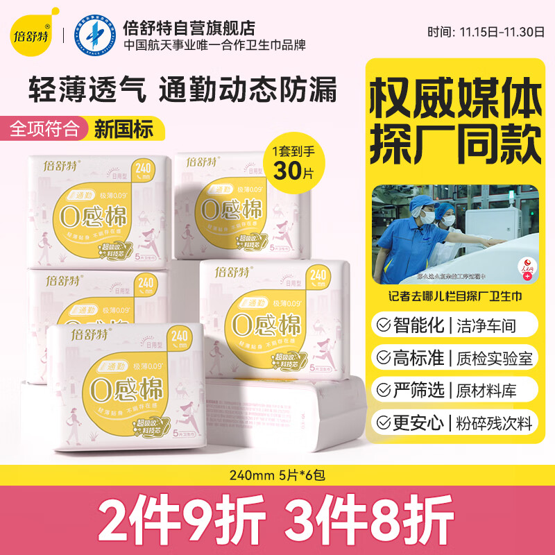 倍舒特0感棉 超薄透气棉柔日用卫生巾240mm30片 京东自营姨妈巾
