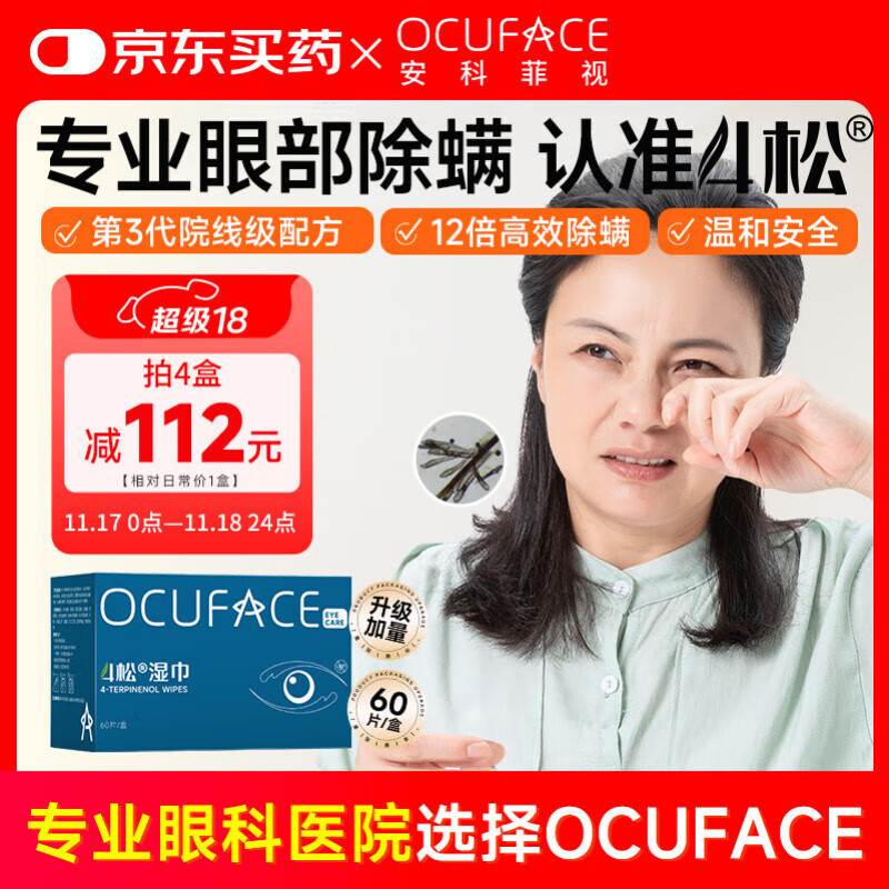 OCUFACE欧科4松湿巾四松油醇眼部除螨茶树油精华眼贴除螨虫棉片60片/盒