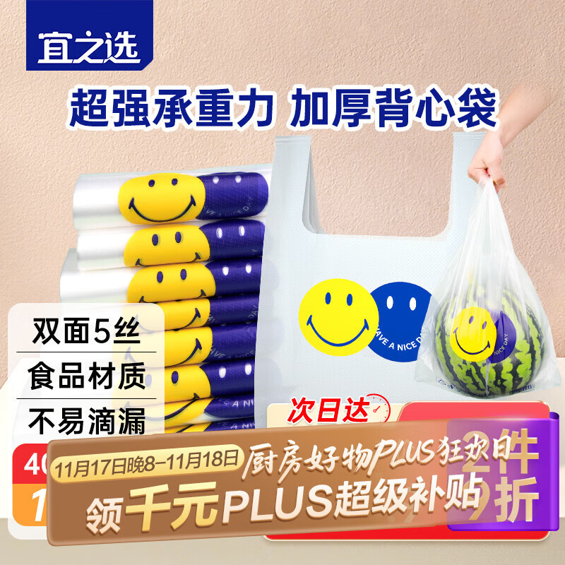 宜之选塑料袋加厚40*60cm背心袋大号笑脸袋100只食品打包袋方便袋马夹袋