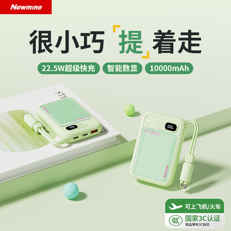 纽曼(Newmine)充电宝【3C认证|可上飞机】10000毫安时自带线 22.5W/PD20W快充移动电源适用苹果17华为小米 绿色