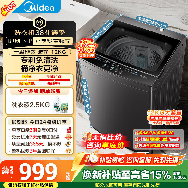 美的(Midea)随心洗 波轮洗衣机全自动家用 大容量 专利免清洗 除螨 以旧换新 国家补贴 官方旗舰 一级能效 波轮 12kg MB12L2