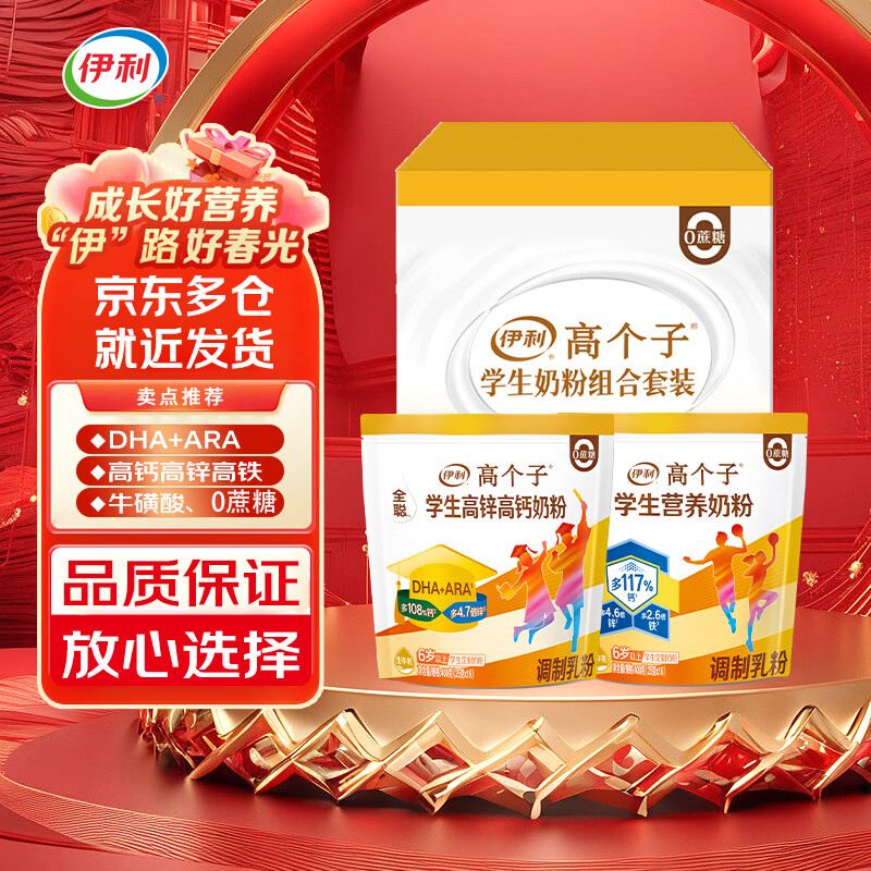 伊利高个子学生营养+全聪学生奶粉组合套装400克*2袋高锌高钙早餐冲饮