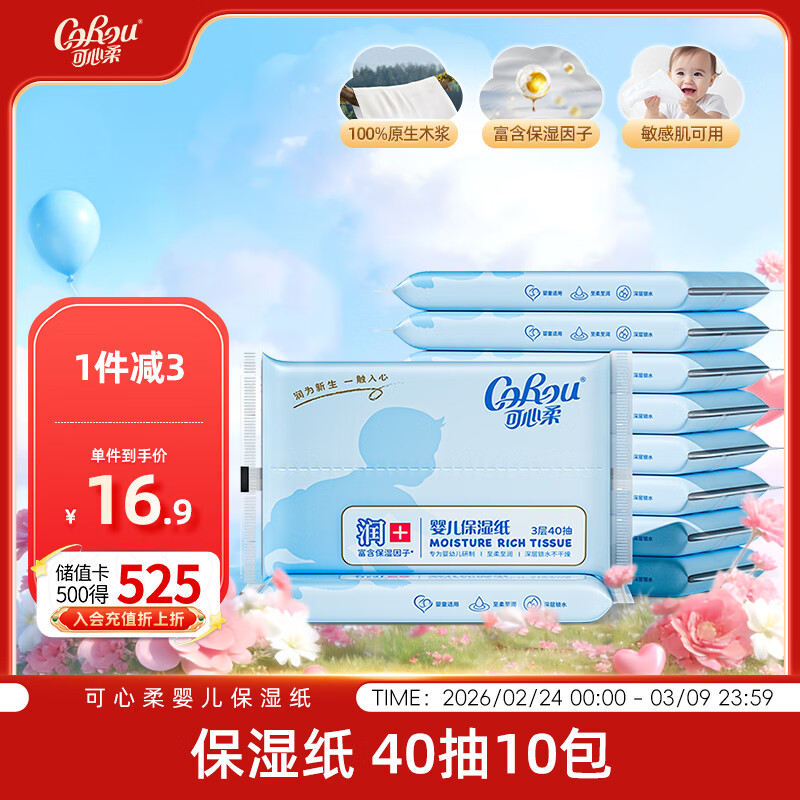 可心柔(COROU)抽纸 保湿纸巾 云柔巾 3层40抽*10包S码 便携装 乳霜纸抽纸