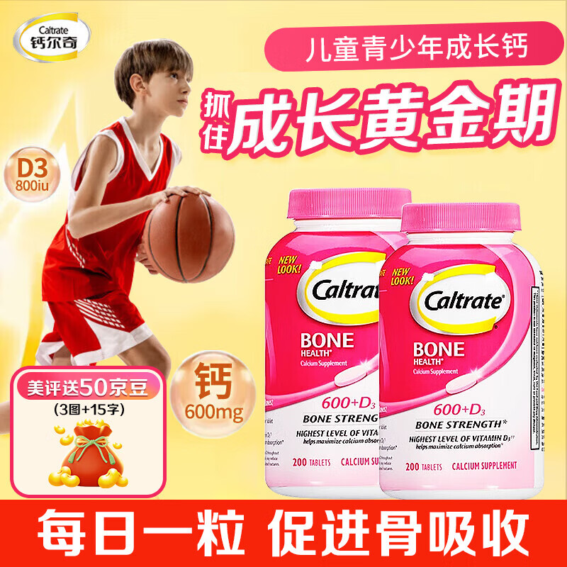 钙尔奇钙片青少年补钙11-17岁6-18-25岁助长高儿童4-17岁长个子维生素d3 【90%的人选择】 200粒*2瓶 儿童青少年长高钙