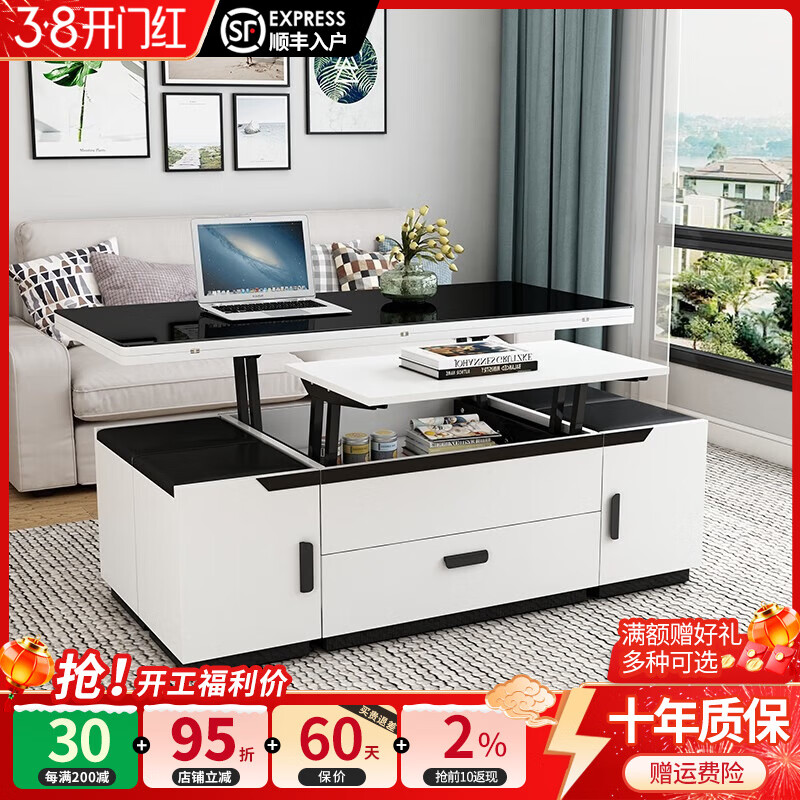 初暖升降茶几餐桌两用小户型简约实木可伸缩折叠多功能茶几电视柜 黑色玻璃 升级实木板(90%客户购买)