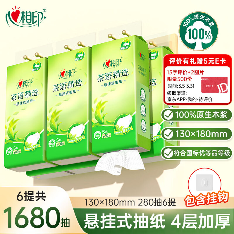 心相印抽纸纸巾悬挂式面巾纸家用卫生纸实惠装餐巾纸 【6大提1680抽】4层280抽*6提箱装送挂钩