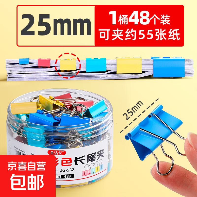 彩色长尾夹燕尾夹票据夹大号中号小号文件夹小夹子办公用品铁夹子文具试卷固定书本 彩色长尾夹-彩色25mm(48个)-1筒装