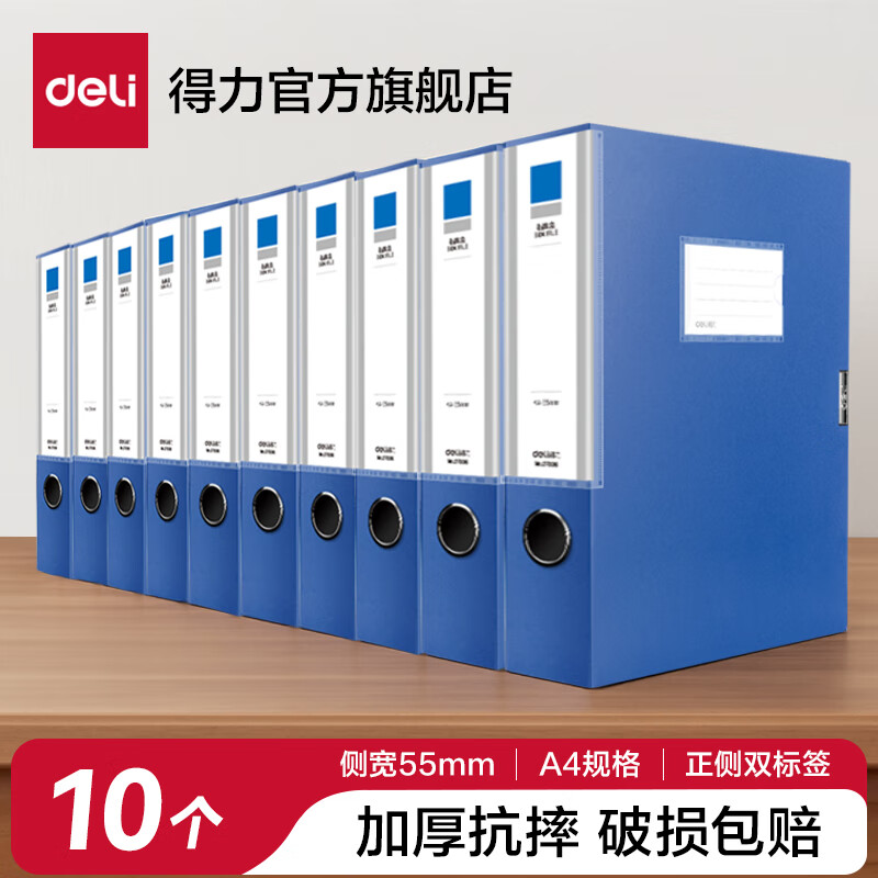 得力(deli)【10只装】A4粘扣档案盒塑料文件盒塑料加厚资料盒文件收纳盒财务凭证整理办公用品 【10个】深蓝-背宽55mm