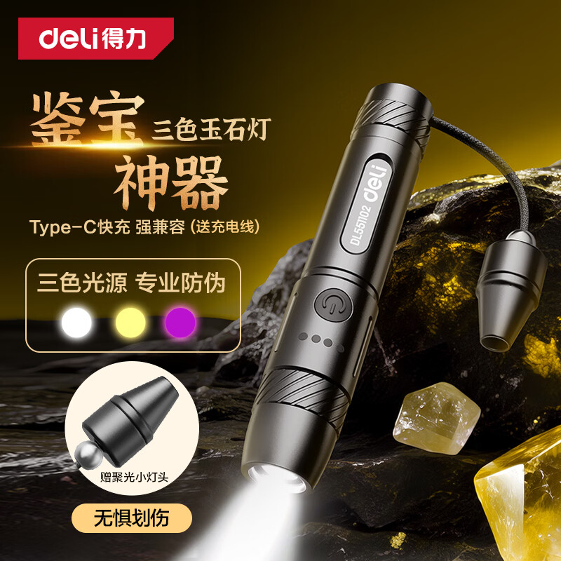 得力(deli)玉石手电筒紫光灯395nm蔬菜荧光剂检测专用强光三光源鉴定珠宝