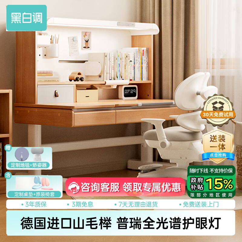 黑白调S2儿童学习桌Pro书桌儿童写字桌全光谱灯桌椅一体进口实木山毛榉