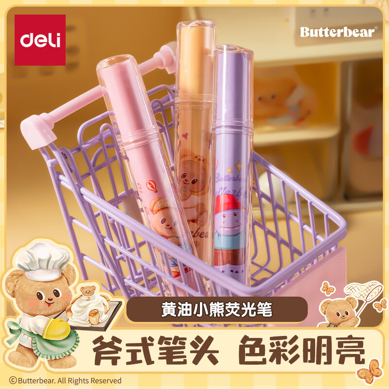 得力黄油小熊IP荧光笔 柔彩考试复习划重点标记学生文具马克笔记号笔手账绘画涂鸦 3支HY008