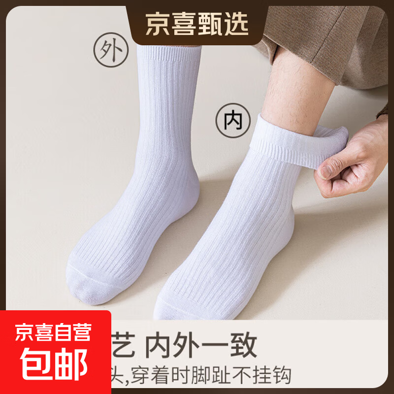 100%纯棉袜子男士秋冬加厚保暖中筒长袜吸汗防臭商务黑色小白袜 男双针长袜-黑色+灰色 5双 均码