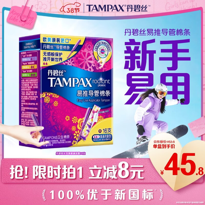 丹碧丝易推长导管式卫生棉条大流量16支内置棉条卫生巾姨妈巾京东自营
