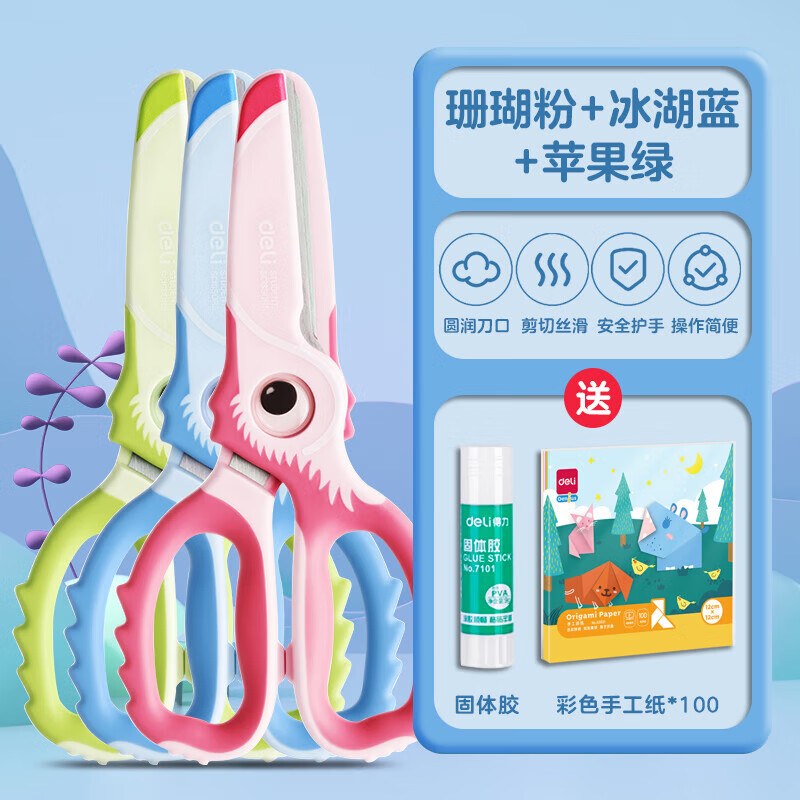 得力儿童剪刀安全手工小学生幼儿园美术剪纸专用圆头包胶不伤手美工剪刀小可爱大嘴鸟剪子学生文具 【三色】送手工纸100张+固体胶 大嘴鸟