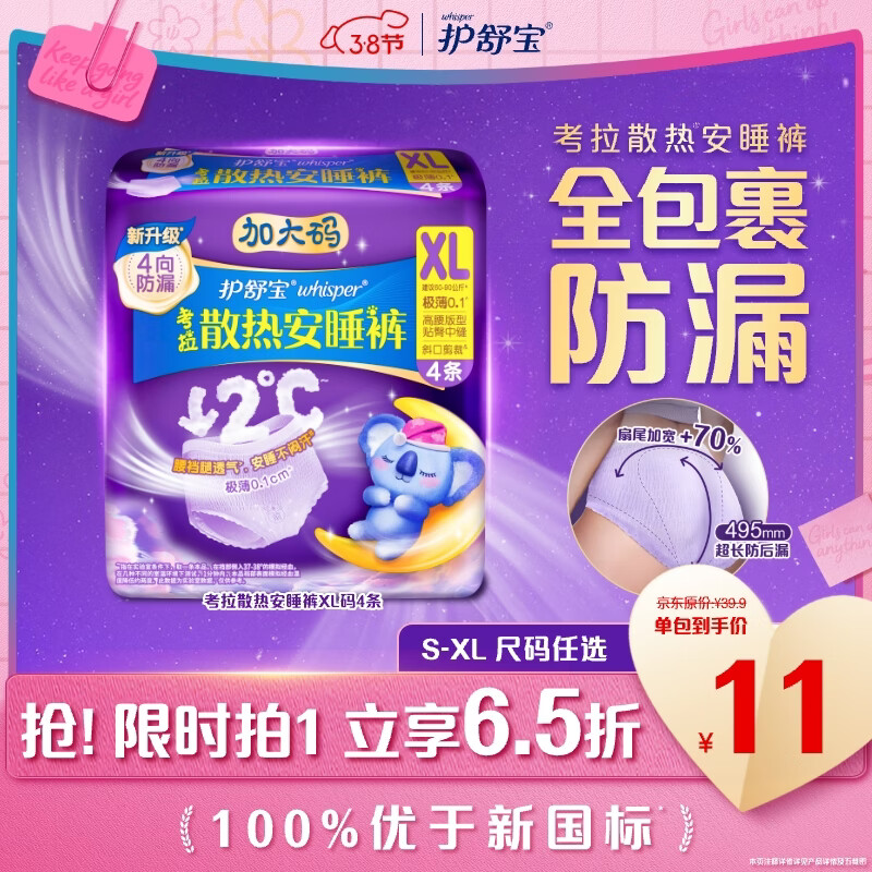 护舒宝考拉散热安睡裤XL加大码4条裤型卫生巾姨妈巾自营密封产后适用
