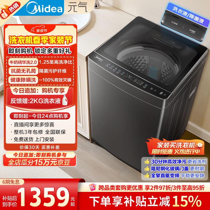 美的(Midea)元气 波轮洗衣机全自动家用 10公斤变频 1.25洗净比 MB10L5 以旧换新 补贴 京东自营官方