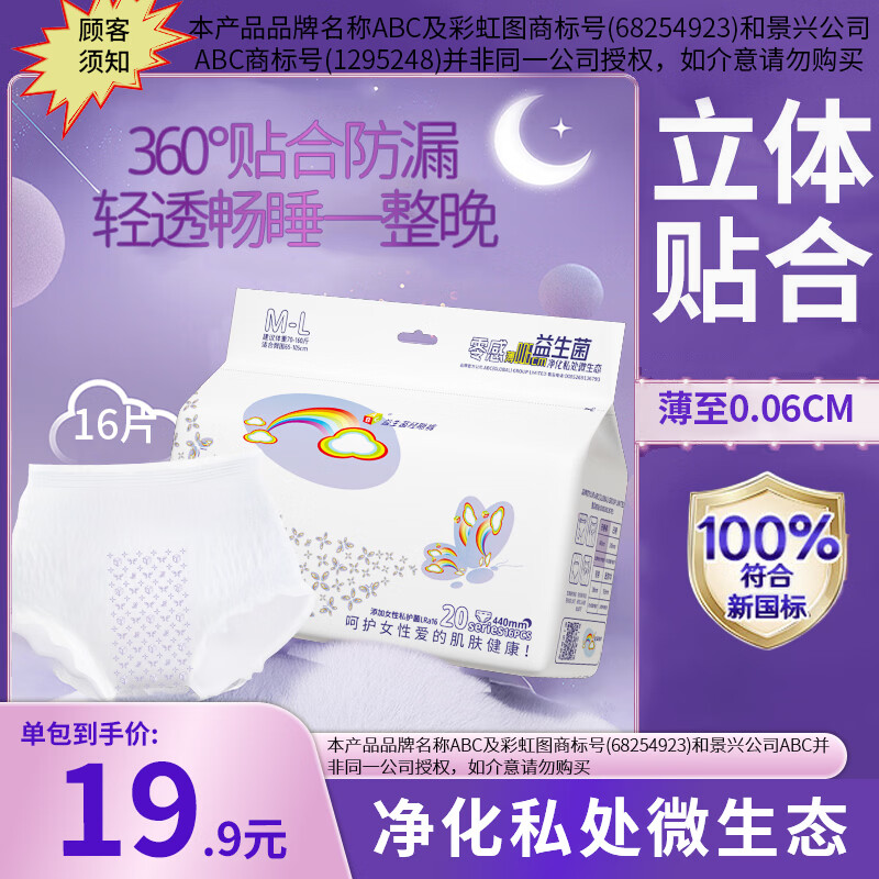 ABC彩虹图品牌益生菌安心裤超薄一次性内裤夜安裤型安睡裤姨妈巾 F码-均码 16条 70-160斤