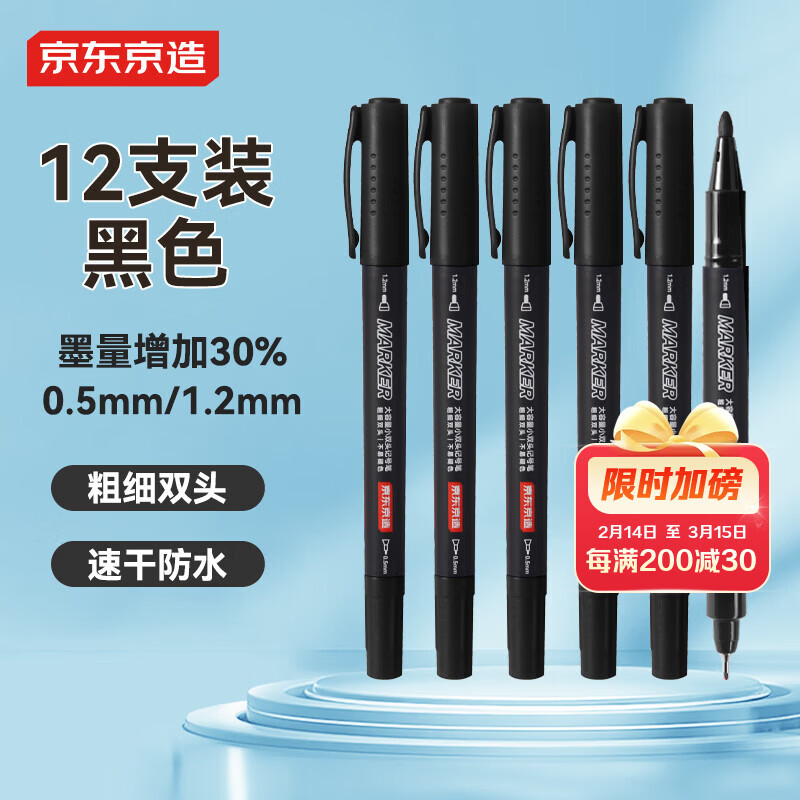 京东京造 大容量小双头记号笔 物流快递会议油性笔签字笔儿童学生勾线笔速干防水马克笔 黑色12支装
