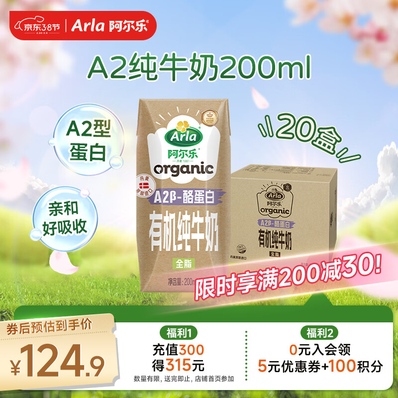 阿尔乐丹麦进口A2β-酪蛋白有机全脂纯牛奶200ml*20 3.6g蛋白年货早餐奶
