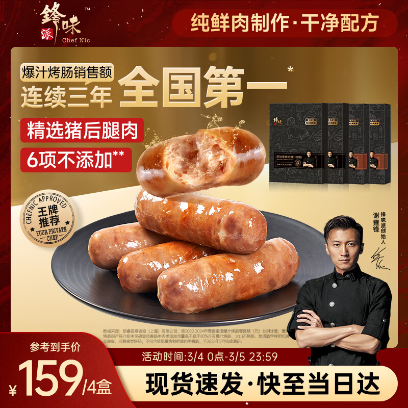 锋味派爆汁烤肠纯肉香肠1600g原味2+黑椒2盒火山石烤肠早餐火腿肠热狗肠