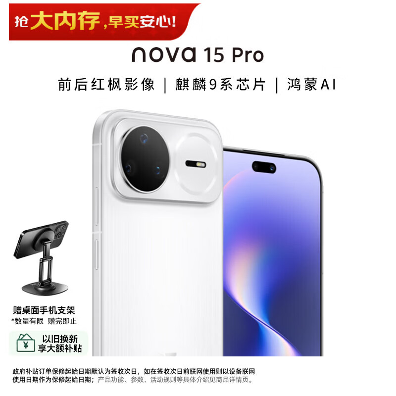 华为(HUAWEI)nova 15 Pro 256GB 零度白 麒麟9系芯片 前后红枫影像 鸿蒙AI 臻彩护眼屏鸿蒙智能手机 昆仑玻璃
