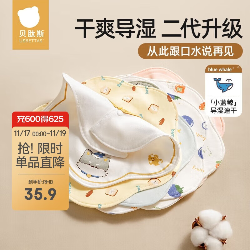 贝肽斯婴儿口水巾宝宝围嘴导湿速干纯棉儿童防水围兜 山竹3条装 28*26cm