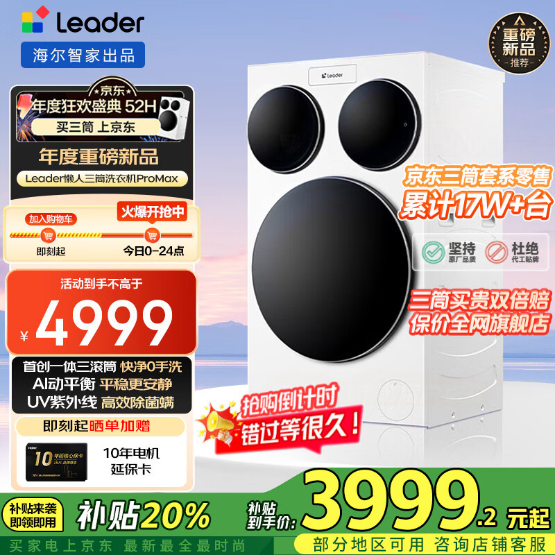 统帅(Leader)懒人三筒洗衣机ProMax 海尔智家出品三桶洗衣机三合一三缸 快净0手洗 滚筒全自动分区健康洗 XQGL125-MBLDE697WU1