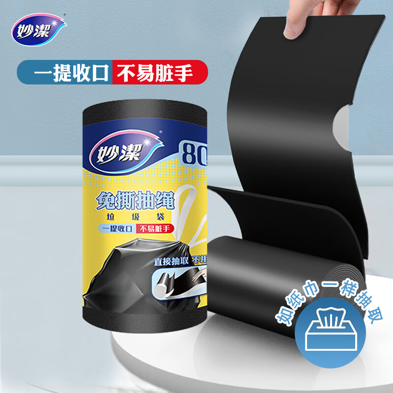 妙洁抽绳垃圾袋黑色50*55cm80只单面1.0丝免撕式大号厨房用
