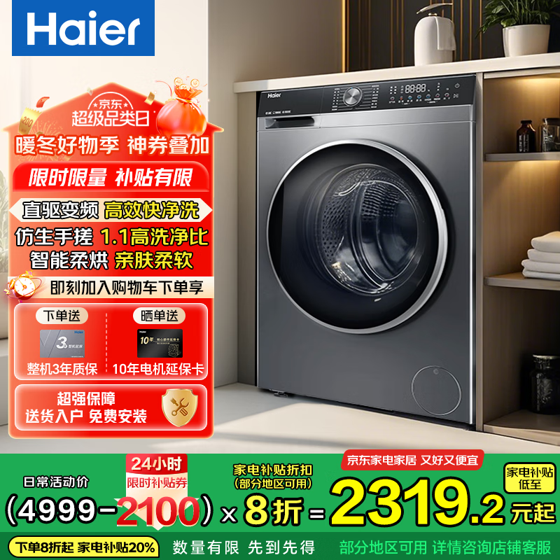 海尔(Haier)滚筒洗衣机全自动 59S洗烘一体机 超薄嵌入10公斤懒人大容量 智能投放1.1洗净比排名前十 国家补贴 10KG超薄直驱洗烘一体【内衣洗 羽绒洗 空气洗】