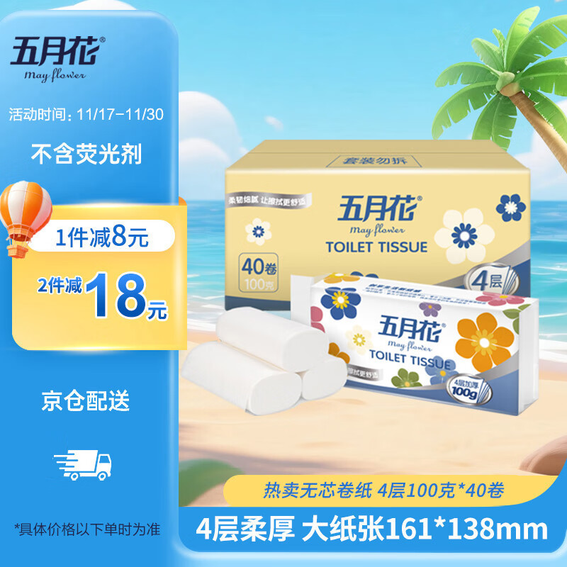 五月花(May Flower)无芯卷纸 4层100克*40卷 厚实柔韧丝滑厕纸卫生间纸巾 整箱销售