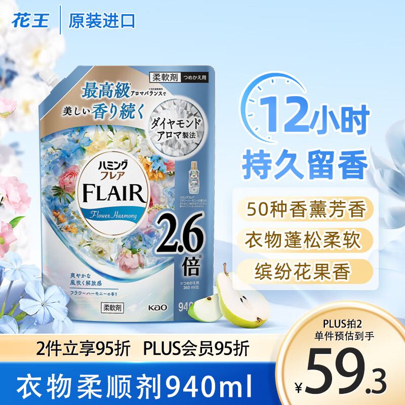 花王(KAO)衣物柔顺剂大容量940ml 香氛持久留香防皱去除静电衣服柔软剂