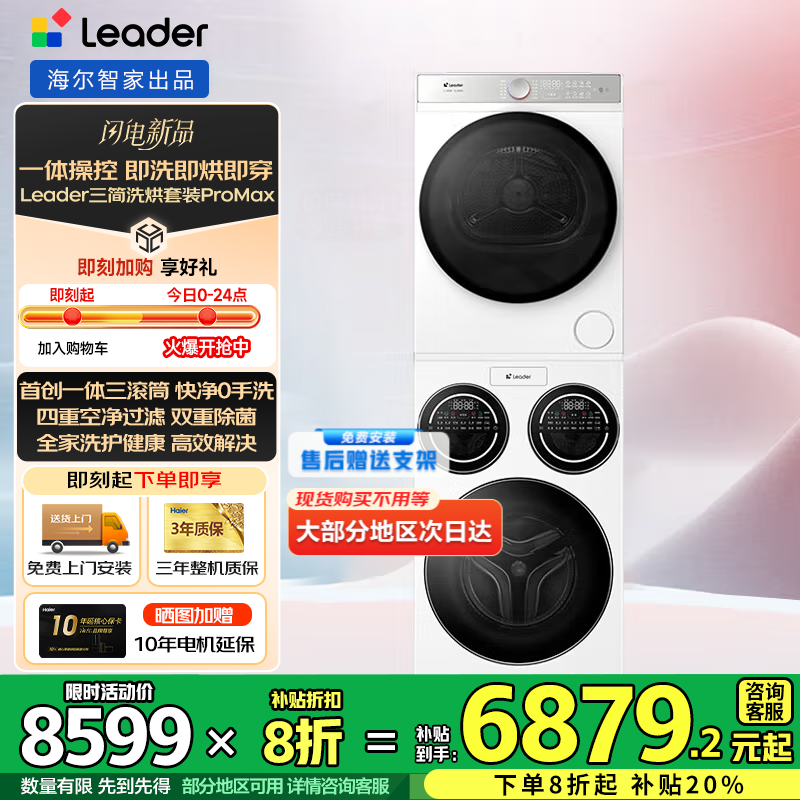 统帅(Leader)海尔智家懒人三筒洗烘套装ProMax 洗衣机烘干机组合 懒人快净0手洗HL12510-MBLDE697WU1 三筒懒人洗衣机+白巧热泵干衣机