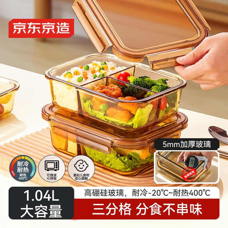 京东京造琥珀色高硼硅耐热可微波分格保鲜盒学生上班族便当盒三分格1040mL